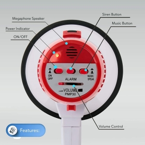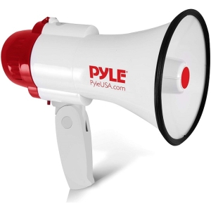 30-watt handheld megaphone with siren, adjustable volume, and 800-yard range, ideal for public address and outdoor use.