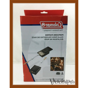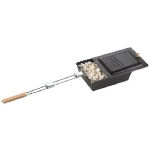 Steel campfire popcorn popper with 2-quart capacity and wood handle. Hinged lid and enamel finish. Ideal for outdoor use over open flame.