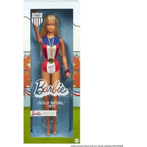 A retro revival of the 1975 Gold Medal Barbie, this collector doll features vintage styling, sporty flair, and nostalgic packaging. Perfect for Barbie collectors and Olympic memorabilia fans.