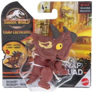Triceratops joins the Snap Squad lineup with a gentle snarl and stylized flair. A fan-favorite herbivore in bite-sized form — perfect for collectors building out the Camp Cretaceous herd.