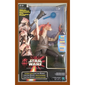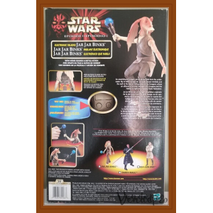 12-inch electronic Jar Jar Binks figure with movie sounds and energy ball action, part of Hasbro’s Episode I interactive line. Box may show wear -Batteries might need changing.