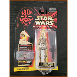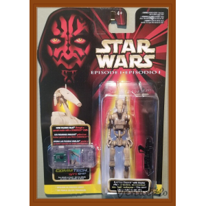 1999 Hasbro 3.75-inch Battle Droid figure with weathered deco and English CommTech chip, part of Episode I Collection 1. Packaging has 2 dents on bubble.