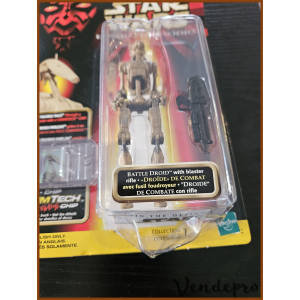 1999 Hasbro 3.75-inch Battle Droid figure with slashed torso and French CommTech chip, from Episode I Collection 1 (UPC: 076930842218). Bubble has dent and cut, Contents are intact. (See Pictures)