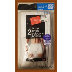 2-pack of white Hanes boxer briefs in size L. 100% cotton with Comfort Flex waistband and tagless design. Functional fly and long-leg style